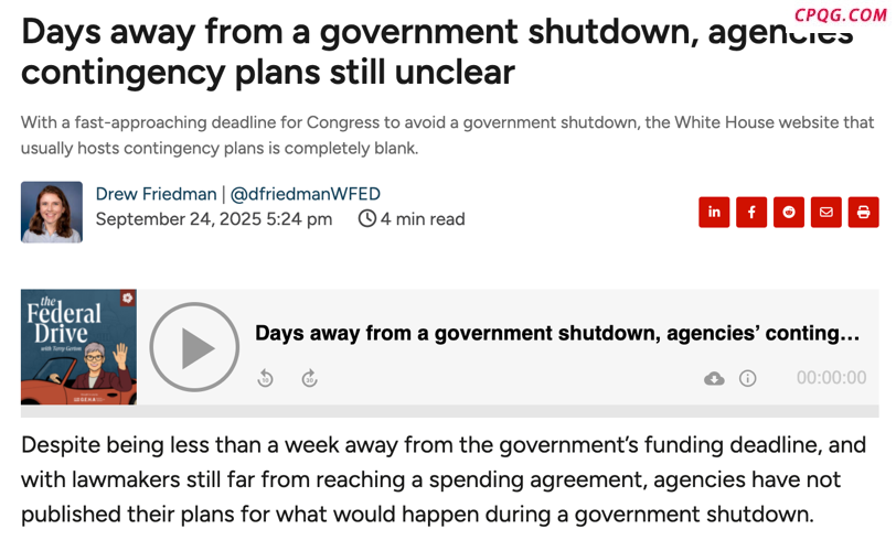 △专门聚焦报道联邦政府管理与政策的美国媒体Federal News Network报道,尽管政府面临“停摆”,但两党在主要问题上的分歧远未达成一致。