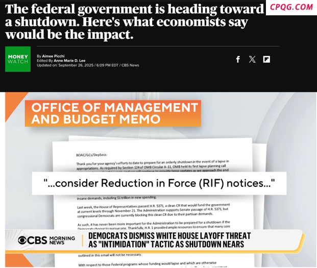 但就在这一关键时刻,白宫又横生枝节。白宫管理和预算办公室9月25日下令各机构为裁员(Reduction in Force,RIF)做准备,而不仅是以往惯常的非必要岗位人员无薪休假。“RIF”是美国政府人事和劳动管理领域的术语,通常指因经费、编制、机构调整等原因进行的裁员、精简人员、撤销岗位。因此,此举既是应急方案,也被视为向国会施压。如果继续僵持,后果可能不只是短暂停工,还包括机构和雇员结构的永久变化。