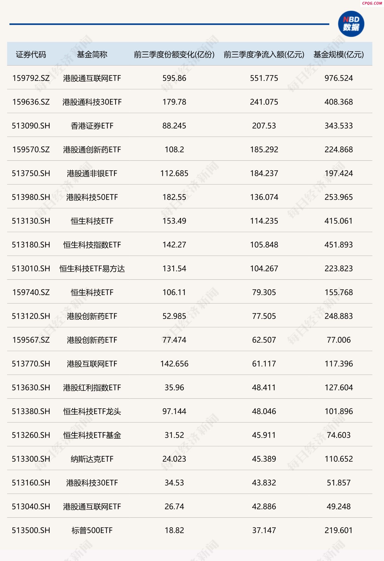 港股通科技30ETF、香港证券ETF紧随其后,前三季度净流入资金均超200亿元。