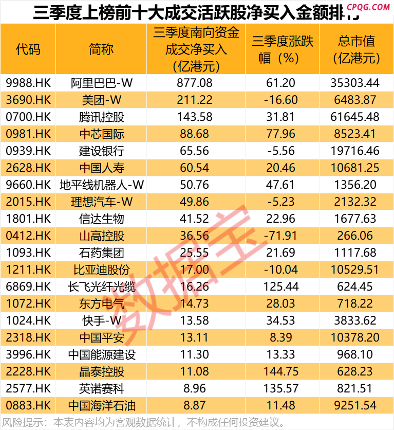 阿里巴巴-W三季度持续获得南向资金大手笔加仓,港股通成交总额、成交净买入金额均居于首位,港股通持股量已连续12周上升,续创港股通开通以来新高。三季度阿里巴巴-W持续上涨,累计上涨61.2%,最新总市值已达到3.53万亿港元,成为港股互联网巨头中本轮行情中表现最好的个股。