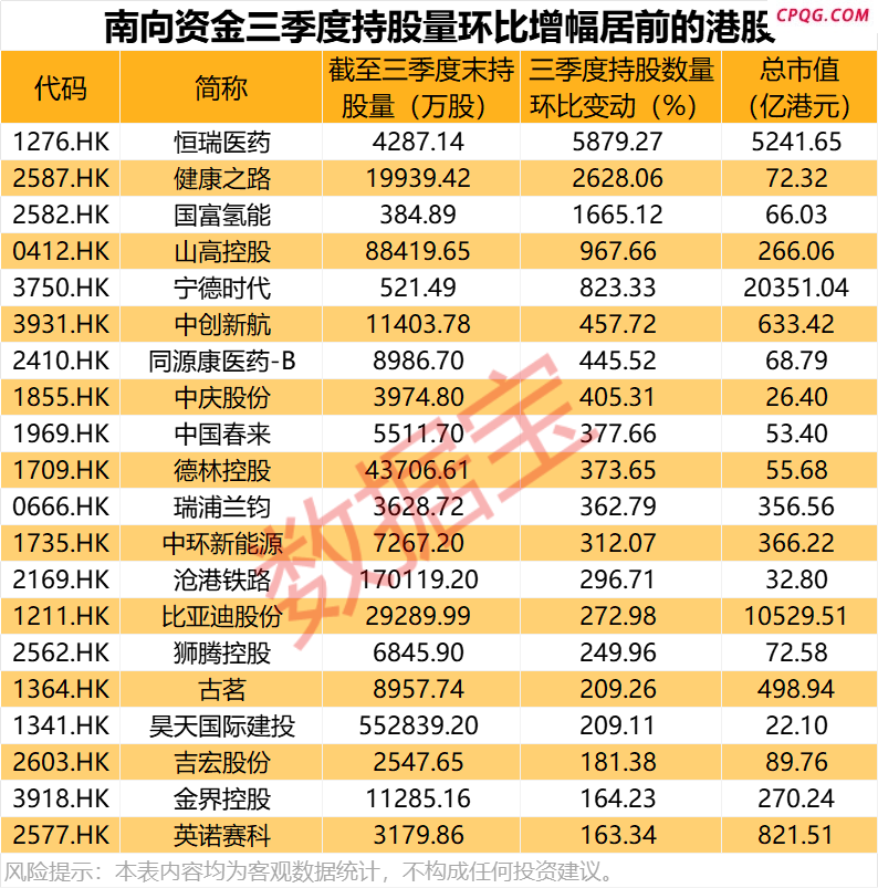 从持股量变化来看,三季度38股获得南向资金持股量环比增长超100%,恒瑞医药居首,环比增长5879.27%;其他还有健康之路、国富氢能持股量环比增长1000%以上。