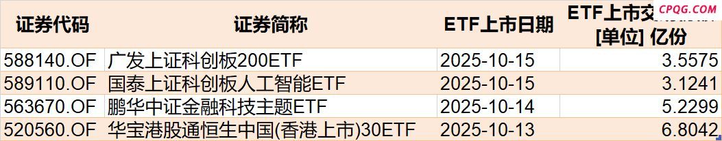 目前有4只ETF披露下周上市,跟踪标的为科创板200、科创人工智能、金融科技、恒生中国30等。