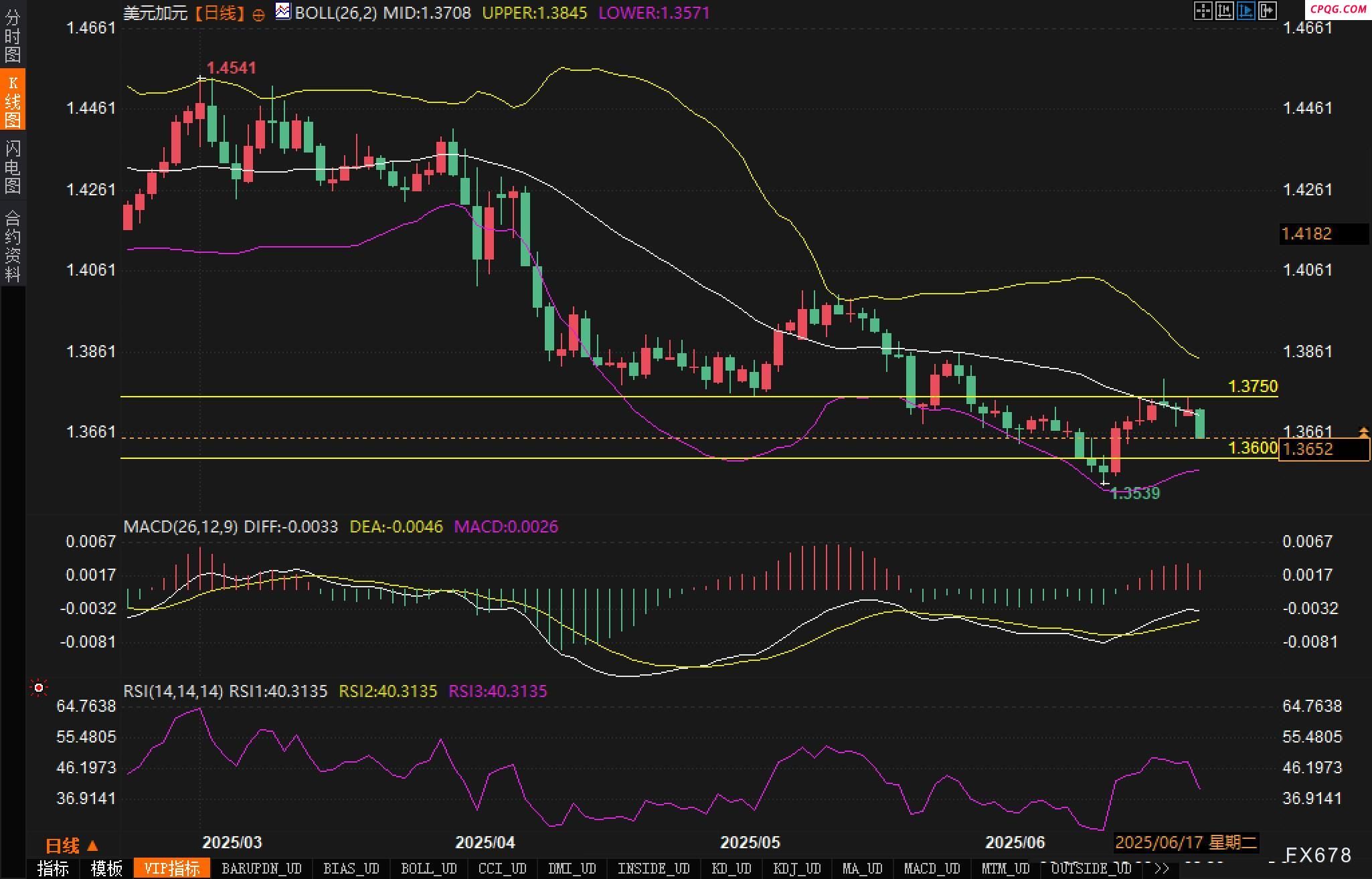 从日线图观察,美元兑加元汇价整体维持明显的下降趋势,价格运行于布林带中轨与下轨之间,显示空头掌控节奏未改。布林带下轨当前位于1.3571,而中轨位于1.3708,正好成为目前价格运行的震荡区间。