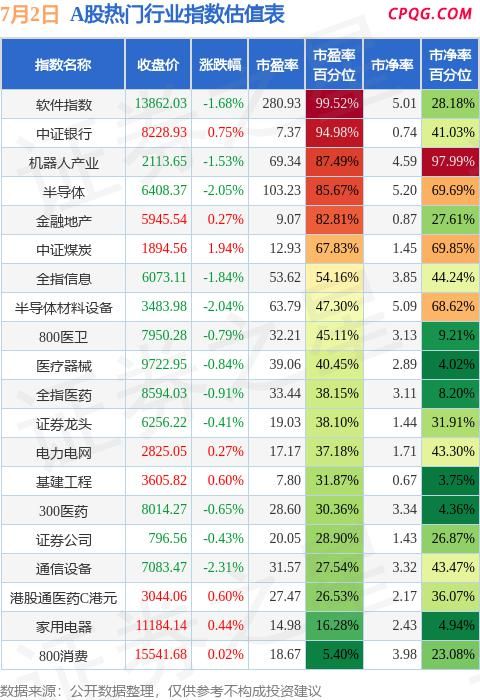 热门行业指数方面,软件指数的市盈率百分位较高,为99.52%。而800消费的市盈率百分位较低,为5.4%。