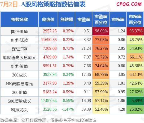 风格策略指数方面,国信价值的市盈率百分位较高,为98.09%。而科技龙头的市盈率百分位较低,为52.46%。