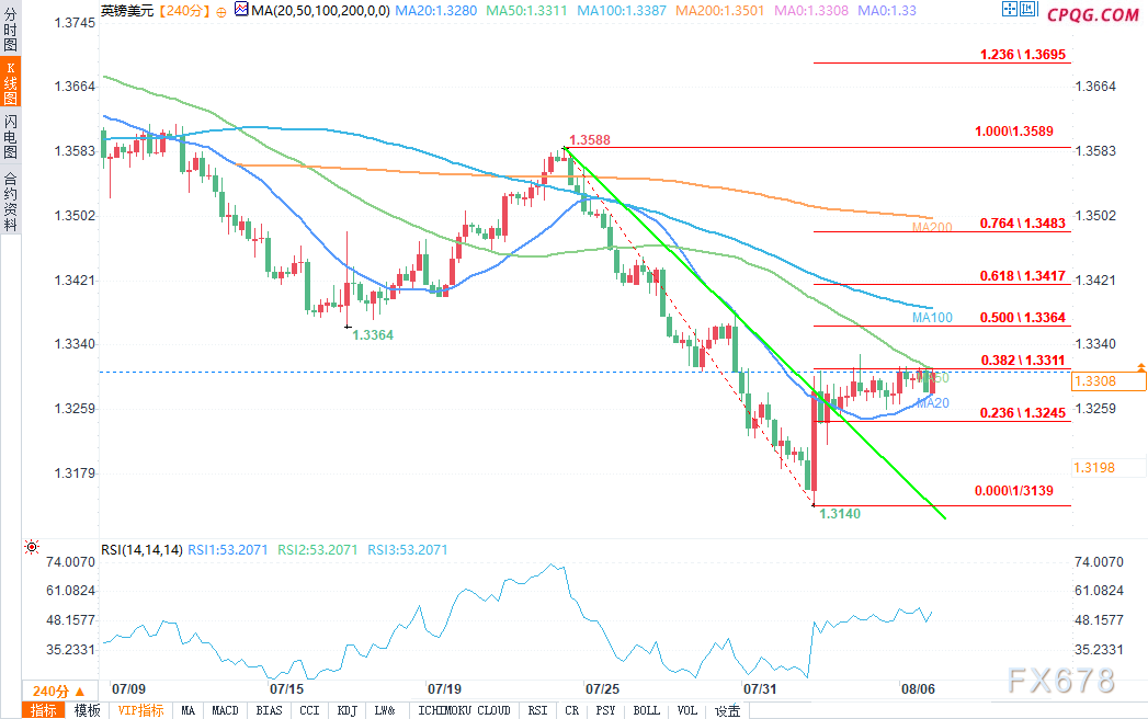 汇价在1.3139形成低点后,目前正尝试反弹,上破1.3250一线,并攻克了那条阻力位在1.3280的下行趋势连接线。