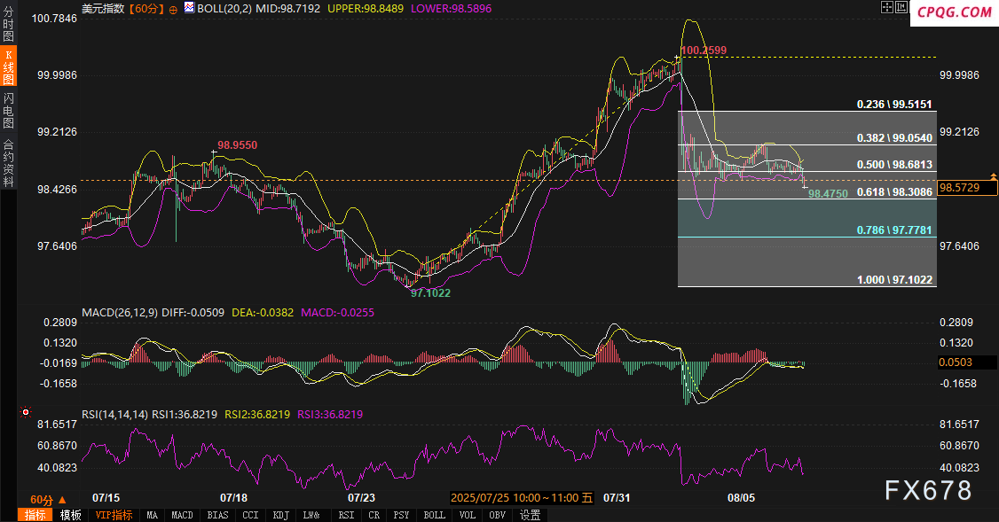 在技术层面,美元指数当前呈现明显的弱势格局。根据最新数据,美元指数在跌破61.8%斐波那契回撤位(98.3086)后,未能有效企稳,显示空头动能依然占据主导地位。相对强弱指标(RSI,周期14)目前报35.0472,已接近超卖区域,暗示短期内可能出现技术性修复行情。同时,布林带下轨已被击穿,MACD快慢线在零轴下方纠缠,表明市场动能偏空,但短期修正的可能性正在增加。