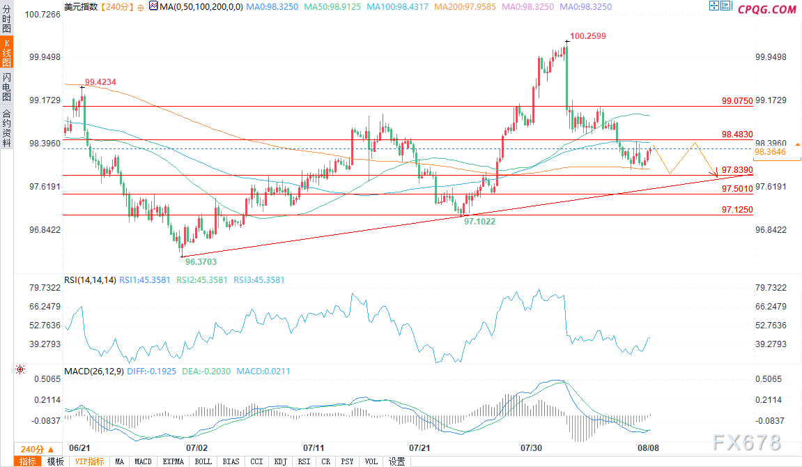 若果断跌破该水平,可能打开通往97.50和97.12的路径。除非指数持续收于98.48上方,否则上行空间有限,届时焦点将转向99.07。