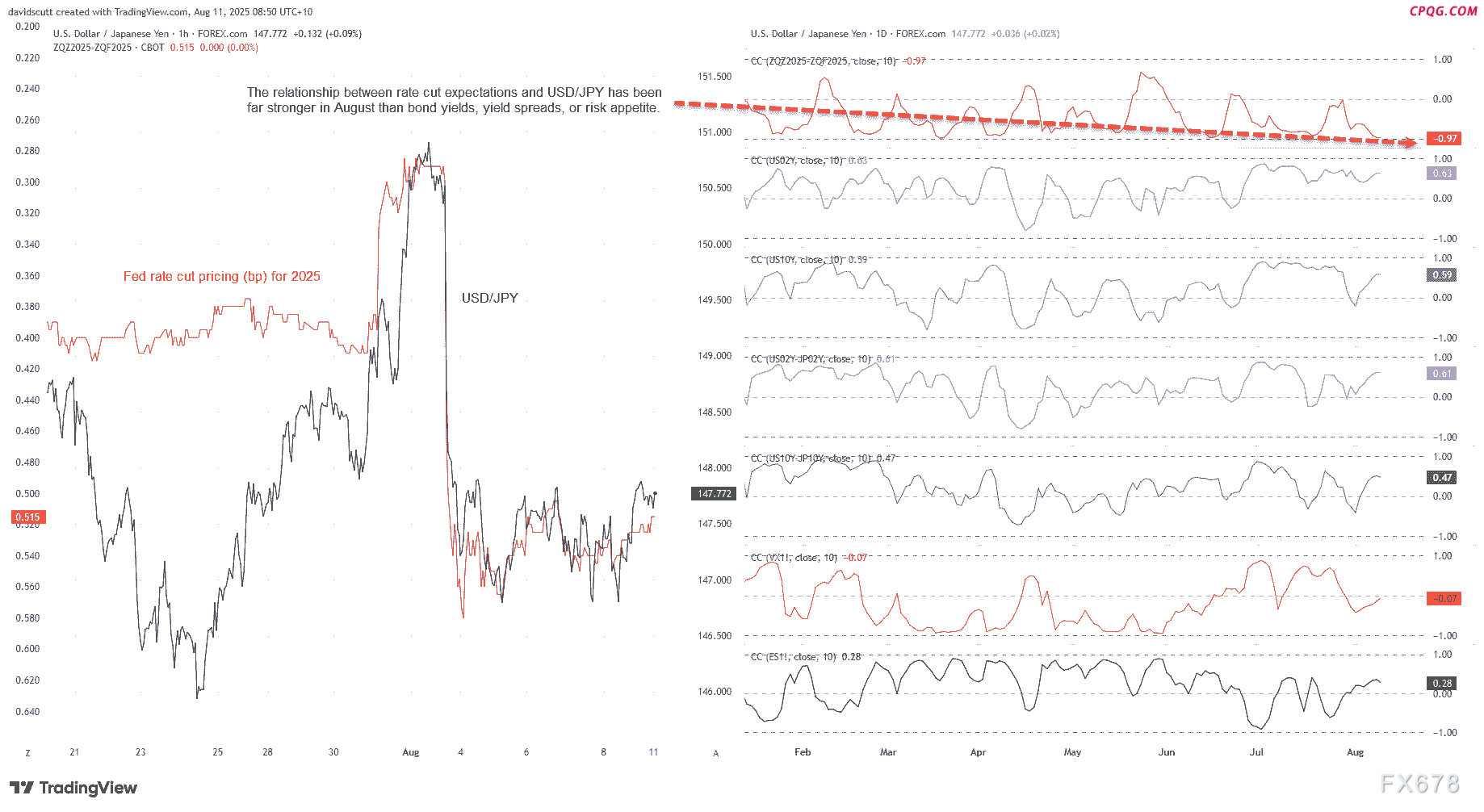 美元/日元正处于关键转折点,147.00-147.95区间震荡明显。美联储降息预期(与汇价相关性达-0.97)已超越美债收益率等传统因素,成为核心驱动力。美国通胀面临双重压力:进口关税推高商品价格,而服务业通胀仍受劳动力市场影响。周五美俄元首会晤可能带来地缘政治风险。
