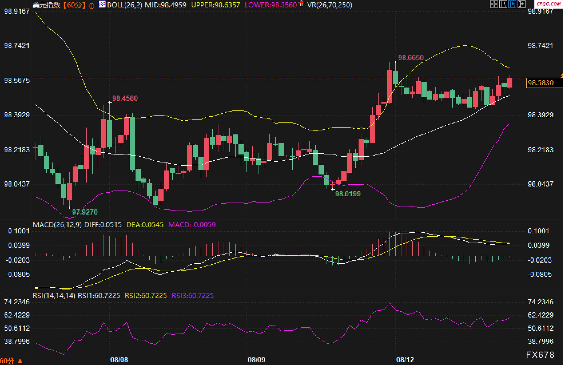 从60分钟图表观察,美元指数当前运行在98.4580至98.6650的相对狭窄区间内,呈现典型的横盘整理形态。布林带指标显示汇价在中轨附近震荡,布林带收敛态势明显,暗示市场正处于方向性选择的关键节点。上方阻力位集中在99一线,该位置恰好对应前期高点,构成重要的技术阻力。下方支撑则位于98.0199附近,该水平与前期低点97.9270形成双重支撑格局。