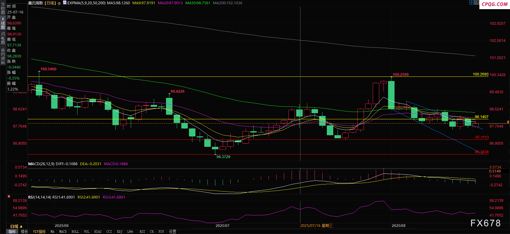 汇通财经APP讯――周一(8月18日)欧市时段,衡量美元兑六大主要货币价值的美元指数(DXY)交投于98.00附近,较前一交易日纽约汇市收盘价97.85微幅波动,整体维持窄幅震荡格局。日线图技术分析显示,美元指数仍处于下降通道形态内运行,暗示整体维持看跌基调。