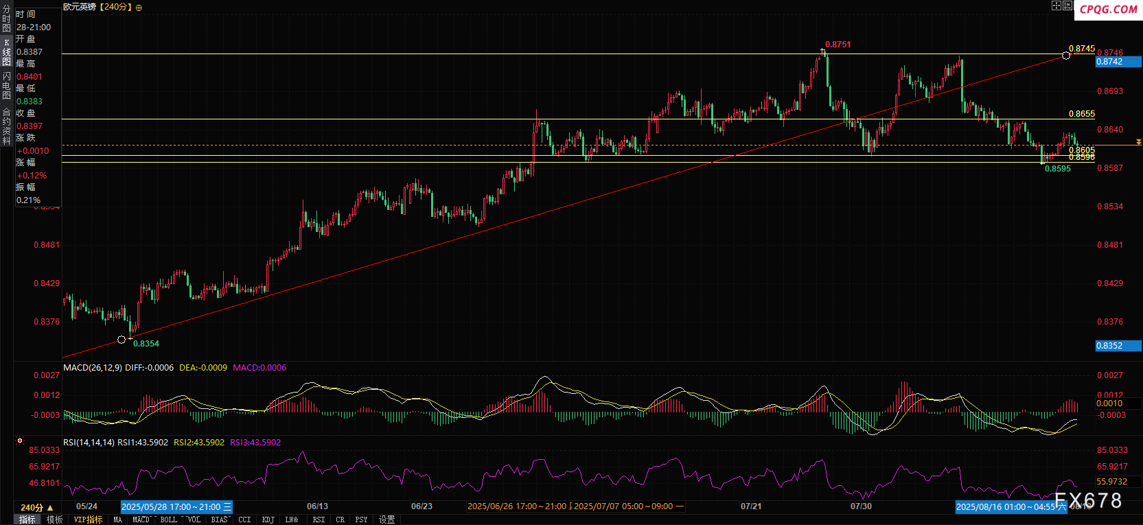 从4小时图来看,欧元兑英镑正下行测试0.8600-0.8610关键支撑区,该区域不仅是过去两个月的交易区间底部,更是8月25日与7月7日低点形成的双顶形态颈线位(此前顶部位于0.8740-0.8750区间)。