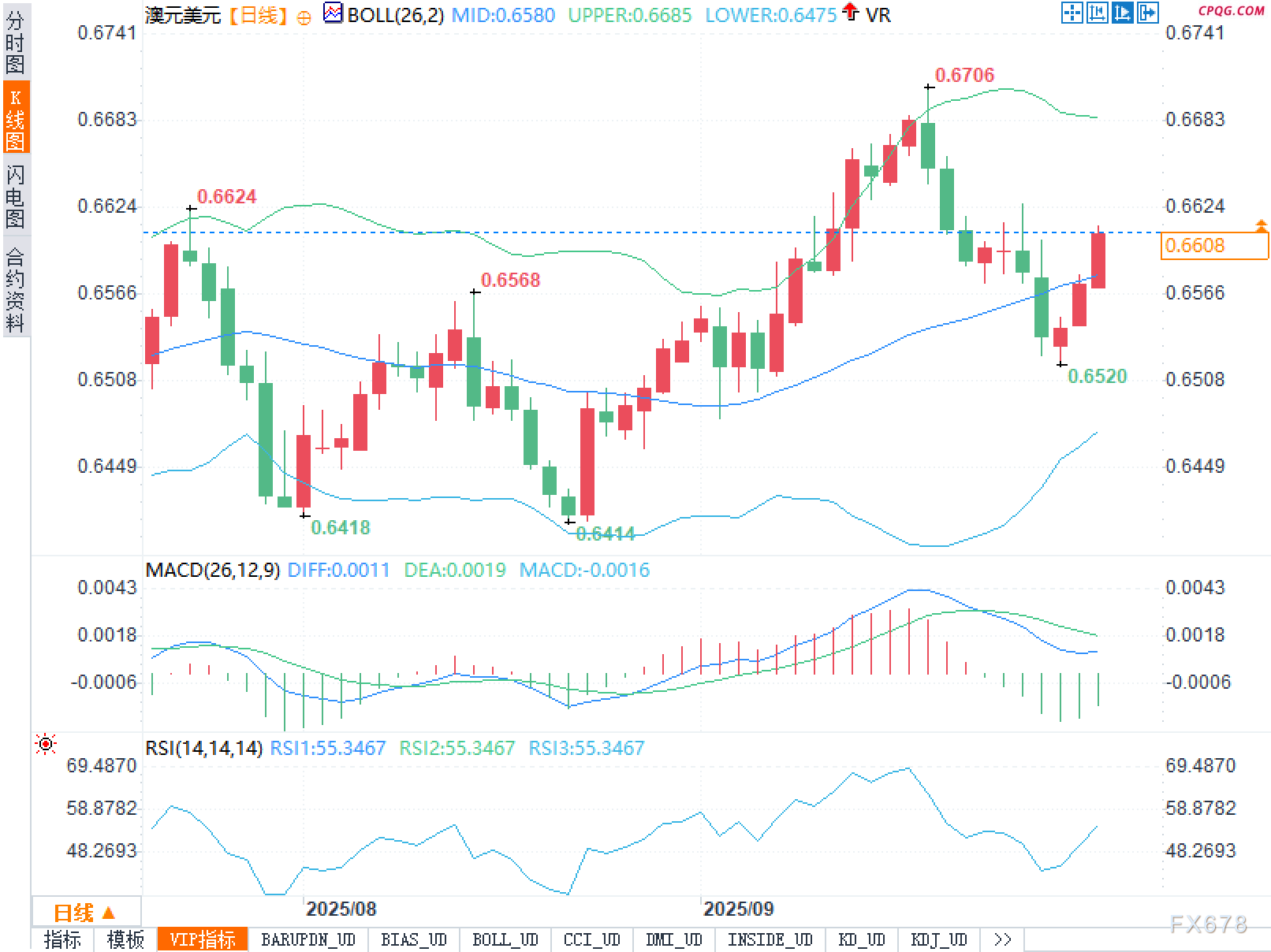 汇通财经APP讯――周二(9月30日),澳元兑美元(AUD/USD)欧洲时段交投于0.6600上方。基本面上,一边是澳洲联储(RBA)按兵不动但释放偏鹰信号,另一边是美元中期转弱的市场共识正在积累。两股力量叠加,使得澳元阶段性占优,技术面亦出现与之共振的迹象。