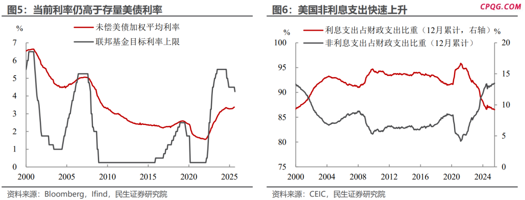 此外,尽管最高法拒绝立即罢免库克,但白宫和美联储的博弈大戏还远未结束。我们在此前的报告中提出,美国债务问题和付息压力的加剧,正蚕食美国经济增长的空间。当前美国存量债务利率维持在3.4%左右,仍远低于美联储的政策利率区间,因此小幅降息无法解决债务的根本问题,至少要100-150bp,这也是特朗普政府一直以来的诉求。