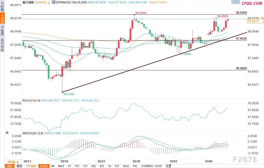汇通财经APP讯――周二(10月7日)欧洲交易时段,美元指数(DXY)连续第二个交易日延续涨势,在98.43附近波动。