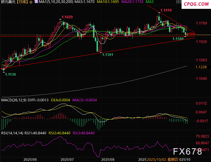 欧元兑美元的即时阻力位位于1.1645-1.1650区间(9月25日和10月6日低点),突破该区间后将面临下行趋势线阻力(目前位于1.1690附近)。若突破这一趋势线阻力,或暗示趋势转向,届时市场焦点将转向上周高点1.1765-1.1775区间。