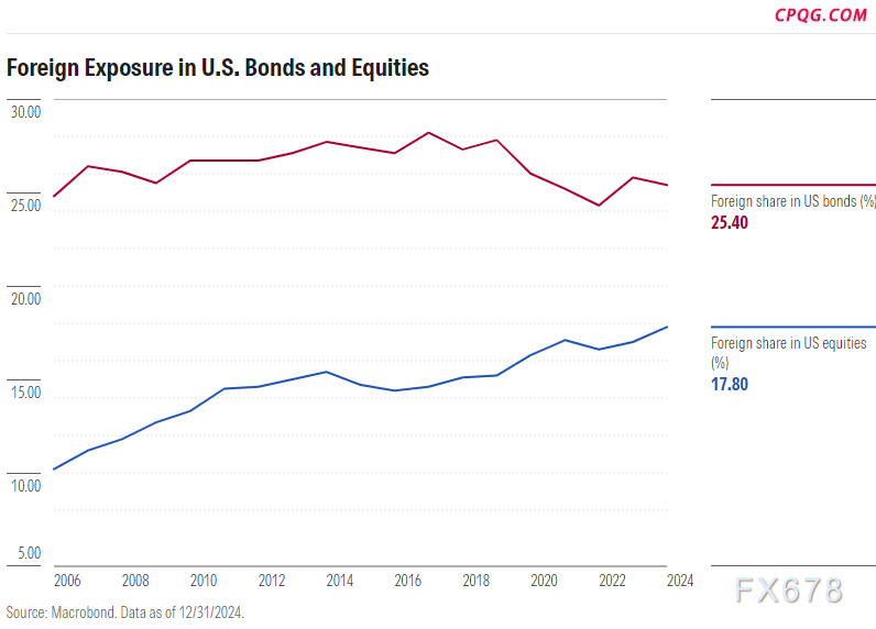 外资持仓维度,当前外国投资者持有约18万亿美元的美国股票资产(约占市场总规模的20%)及7万亿美元的美国国债(约占市场总规模的25%)。