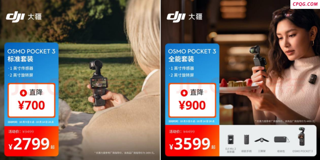10月9日0点,大疆开启包括明星产品云台相机Osmo Pocket 3(下称“Pocket 3”)在内的多款产品的降价促销活动。京东显示, Pocket 3标准套装直降700元,从3499元降至2799元;同型号的全能套装直降900元,从4499元降至3599元。