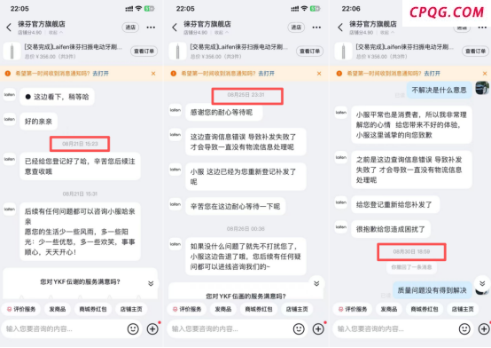 刘女士提供的聊天记录显示,8月21日她向徕芬客服反馈电动牙刷第二次出现充电故障时,客服明确表示会安排补发数据线,并告知已完成登记。但此后,售后进度却陷入停滞。8月25日、8月30日,刘女士两次主动联系客服询问补发进度,得到的回复均是“查询信息错误,导致补发失败”。这意味着,刘女士的售后请求在10天时间里并未被积极解决。