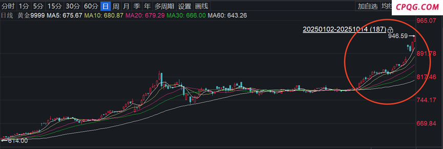 金价还在连涨,势头非常猛。截至10月14日9:30,国内现货黄金Au9999涨2.04%,报945.68元/克,国际现货伦敦金现涨0.45%,首次突破4140,报4146.090美元/盎司。