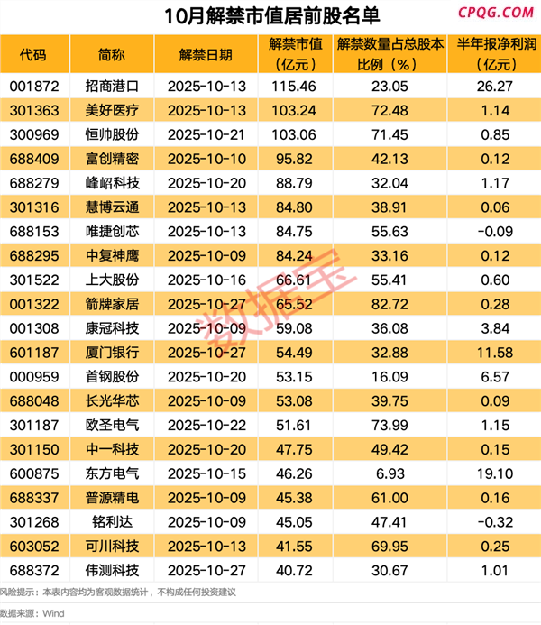 上述解禁股中,3只解禁市值超百亿元,分别是招商港口、美好医疗、恒帅股份。招商港口10月将有5.77亿股上市流通,主要为定向增发机构配售股份,解禁市值达115.46亿元。