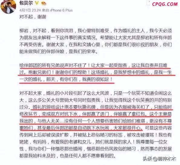 紧接着包贝尔也发长文回应,主动承认闹伴娘是自己的主意,且字里行间全是对伴郎团和新娘的维护,对柳岩的歉意只是一笔带过。