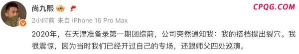 尚九熙第一次知道何九华提出裂穴是在2020年,当时他非常震惊,因为他和何九华已经搭档7年了,开了专场,而且还跟着郭德纲四处巡演。尚九熙可能觉得,两人是并肩作战这么多年且有一定成就的搭档,何九华怎么会想要裂穴。