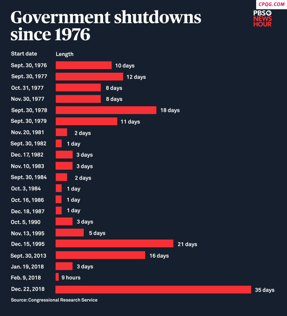 △美国公共广播公司整理的1976年以来联邦政府关门情况一览表