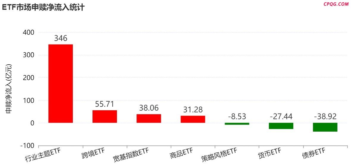 Wind数据显示,本周沪深两市股票型ETF和跨境型ETF合计净流入约431亿元,行业主题ETF净流入346亿元。