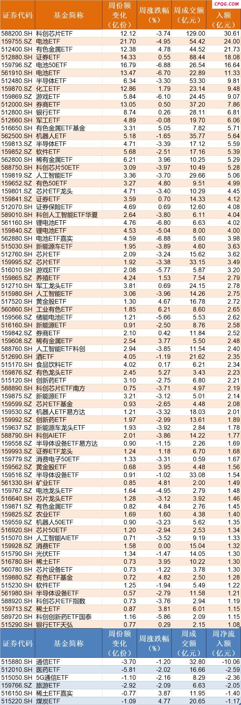 行业主题上看,科创芯片、电池、有色金属等ETF被资金看好,而通信、医药相关ETF被资金抛售。