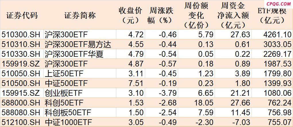 具体ETF方面,规模较大的10只宽基指数ETF本周合计净流入88.32亿元,其中沪深300ETF、科创50ETF净流入均超27亿元。
