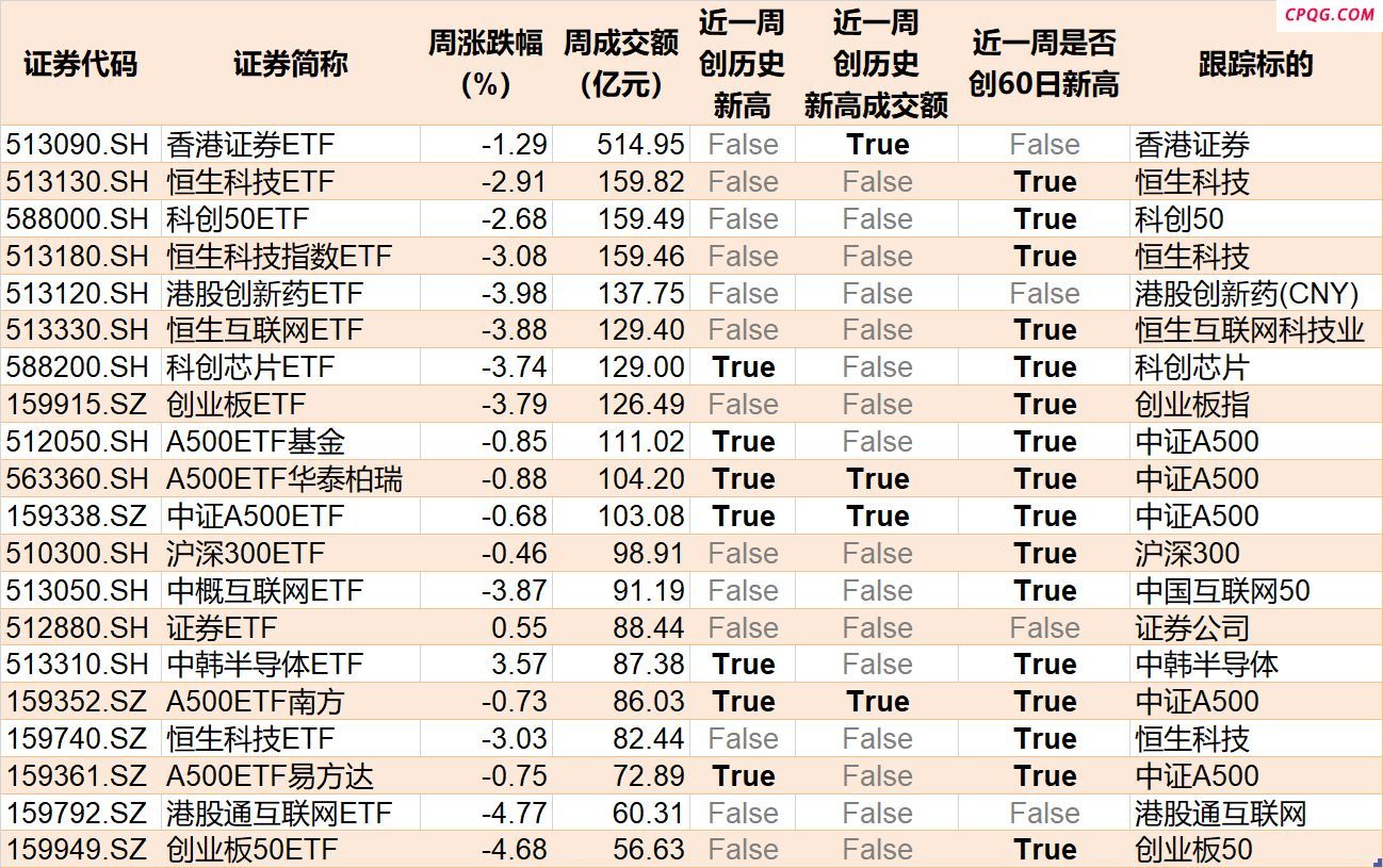本周,股票型ETF和跨境型ETF成交额超100亿元的ETF有11只。