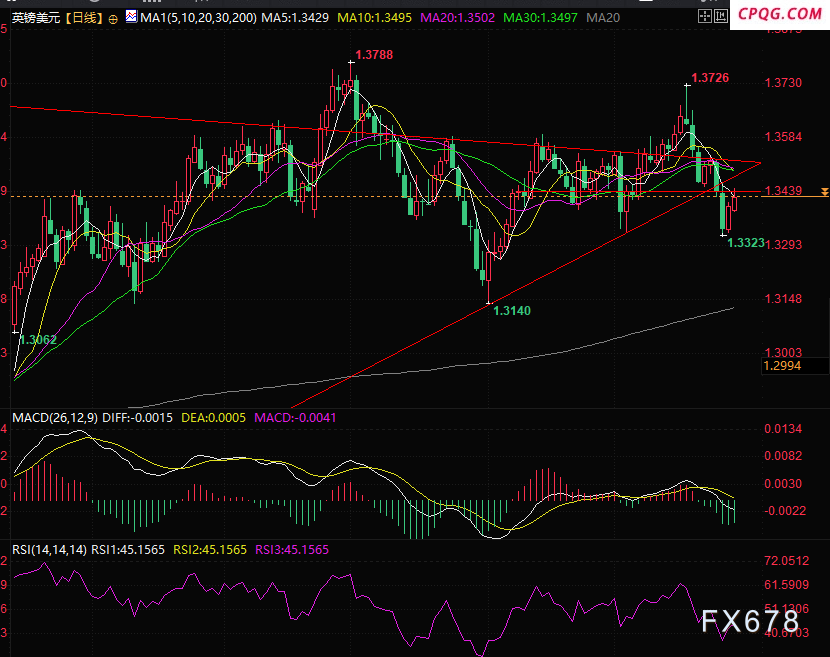 英镑兑美元运行于5、10、20、30日移动平均线下方,同时跌破了1.3439的关键价位和三角形整理形态,MACD和RSI均预示汇价将向空头发展,但是由于镑美今天反弹一度站上5日线以及1.3439关键位之上,英镑存在V型反转可能。1.3400是第一支撑位,同时如果未来汇价站上1.3439,英镑或许可以重升涨势。