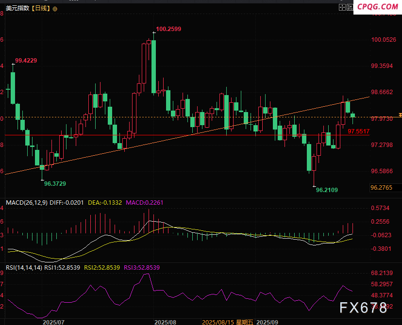 若下行行情兑现,跌破上述支撑区间后,由于两大支撑位之间缺乏有效中间缓冲,美元指数或将测试96.40支撑位。但倘若该支撑区间稳固守住则可以展望上行方向,多头则大概率瞄准98.60阻力位谋求有效突破――自8月初以来,美元指数始终未能攻克这一关键关口。一旦突破并站稳98.60上方,美元指数向100.25阻力位推进的概率将显著提升。