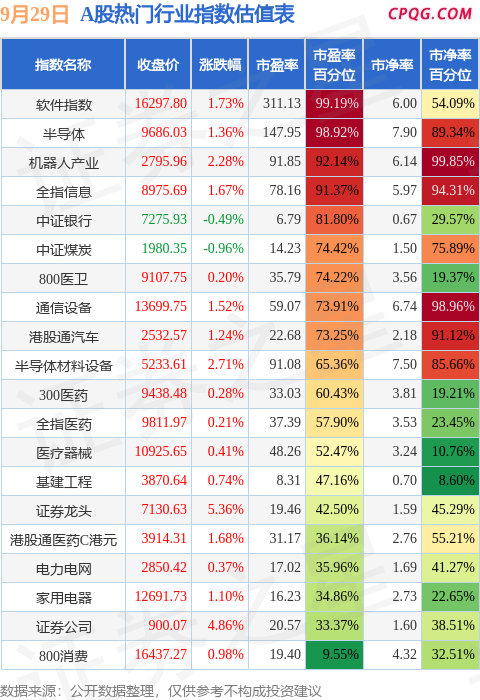 热门行业指数方面,软件指数的市盈率百分位较高,为99.19%。而800消费的市盈率百分位较低,为9.55%。