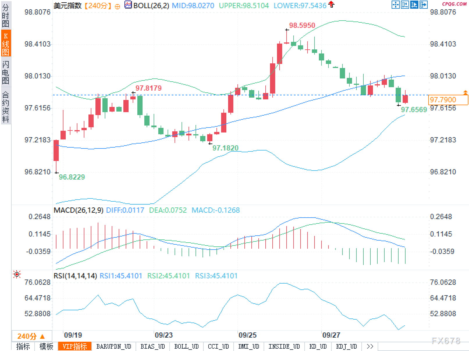 240分钟周期K线叠加布林带与MACD、RSI显示:价格自98.5950的阶段高点回落,当前运行在布林中轨之下、下轨之上;布林中轨98.0270、上轨98.5104、下轨97.5436,带形由扩张转为收敛,波动率阶段性降温。结构上,近期阴线实体偏多,反弹多为上影线较长的小阳,反映上方抛压仍在。MACD的DIFF为0.0117、DEA为0.0752,柱状图为-0.1268且持续为负,动能处于“零轴上方走弱―向零轴回归”的衰减阶段;RSI(14)为45.4101,位于50下方但未触及超卖,典型的弱势盘整。