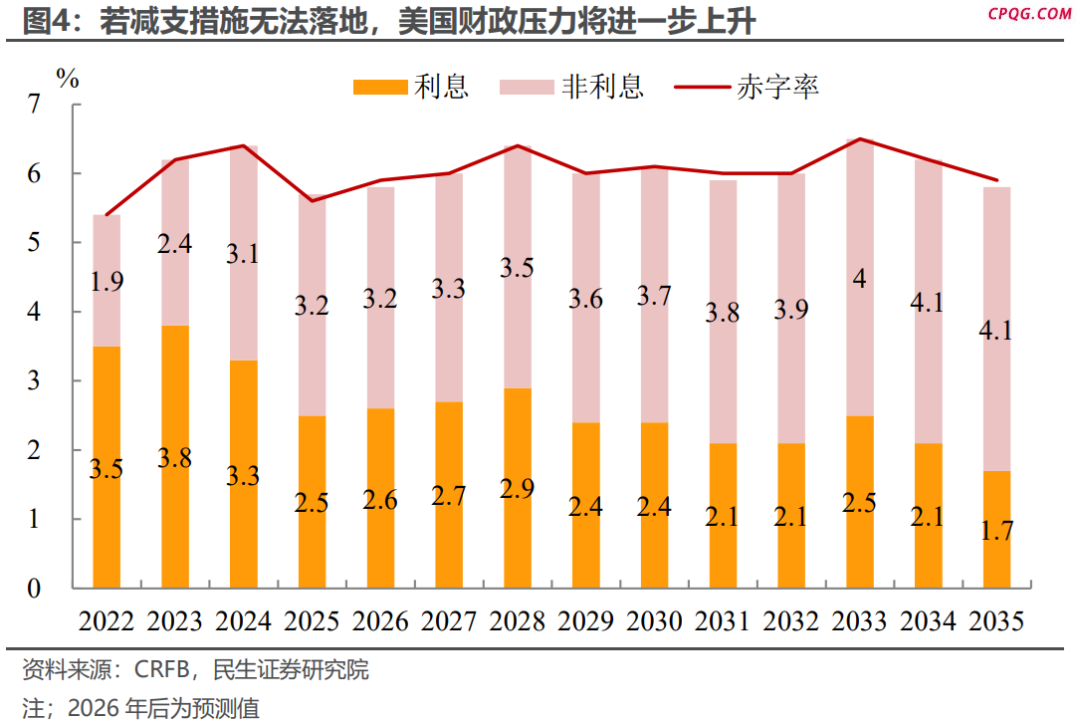 综上,我们维持此前的观点,在美国财政和债务下行的大背景下,美元难以摆脱贬值命运,贵金属的配置价值仍在上升;美债期限利差仍有较大走阔空间;美股表现则需观察AI叙事持续性等因素。