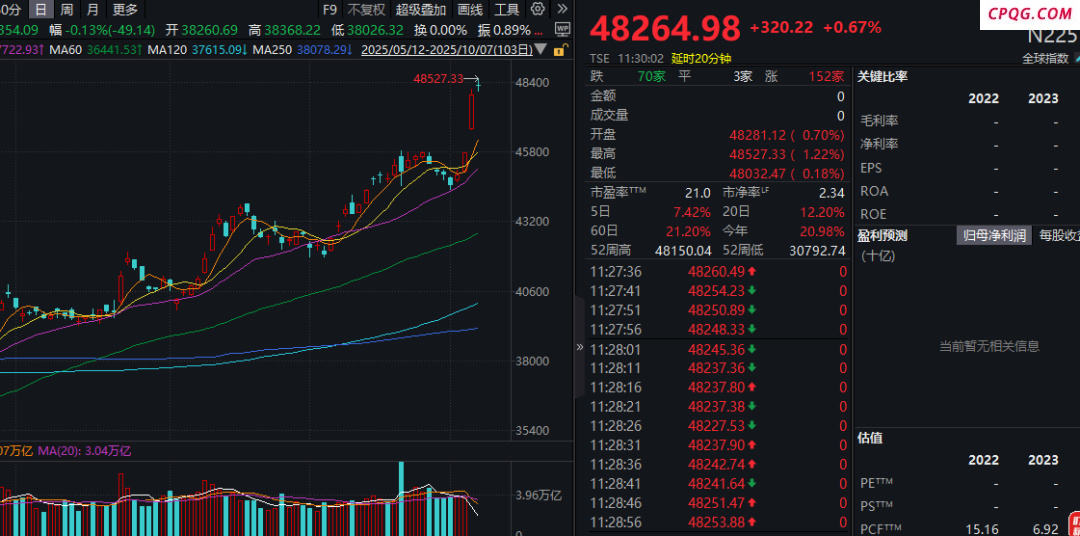 10月7日,日本股市整体进一步上行,其中日本日经225指数上午收盘上涨0.67%,至48264.98点,盘中一度再创历史新高。日本东证指数上午收盘上涨0.28%,至3235.13点。