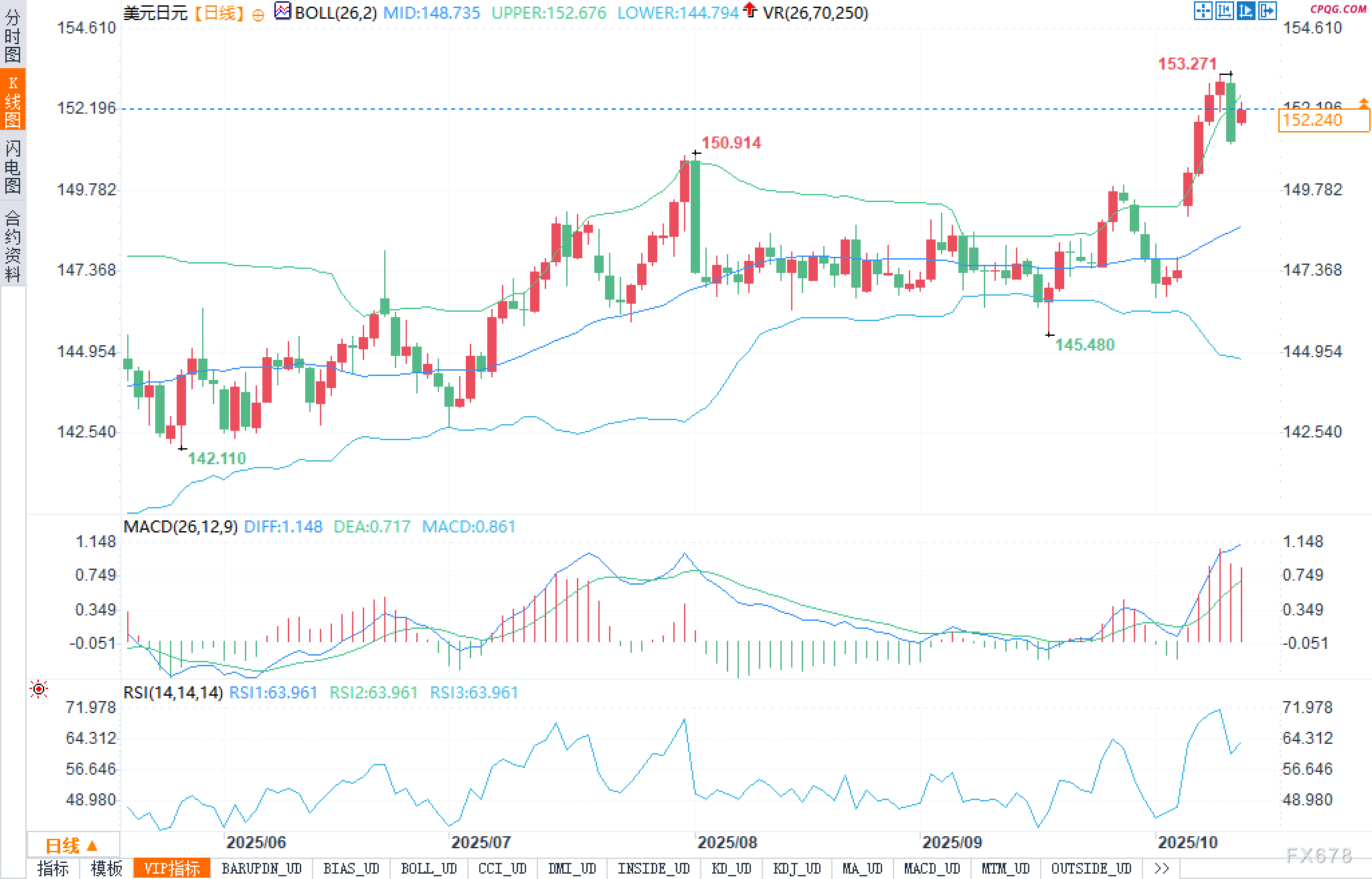 当前日线图上,布林中轨位于148.735,上轨152.676,下轨144.794。汇价运行在中轨之上、上轨之下,属于典型的“强势通道内高位整理”。近期高点153.271标注清晰,前期强势峰值150.914为重要回撤参照;更下方的阶段性低点分别为145.480与更早的142.110。就动量结构而言,MACD(26,12,9)显示DIFF=1.148高于DEA=0.717,柱状图为0.861,处于正值扩张区间,说明中期多头动能仍在释放但已接近前期峰值区域;RSI(14)读数约63.961,位于多头区而未触及典型超买阈(70附近),提示“强势但不极端”。