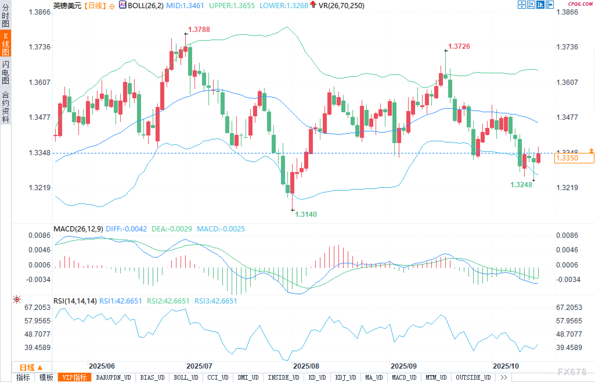 日线图显示,布林中轨位于1.3461,上轨1.3655、下轨1.3268。当前汇价处于布林带下半区运行,说明趋势仍偏空主导但动能趋于钝化。历史价位上,关键摆动高点分别在1.3788与1.3726,低点在1.3140与近期的1.3248,构成了一个上沿逐步下移、下沿缓慢抬升的“收敛型水平通道”雏形。MACD指标(26,12,9)中,DIFF为-0.0042、DEA为-0.0029、柱状图为-0.0025,均位于零轴下方,提示空头仍占据结构性优势,但柱体绝对值较此前有所缩窄,指向“空头动能衰减、技术性反弹仍可延续”。相对强弱指数RSI(14)报42.6651,弱势区间内维持震荡,尚未回到50的强弱分界线之上。