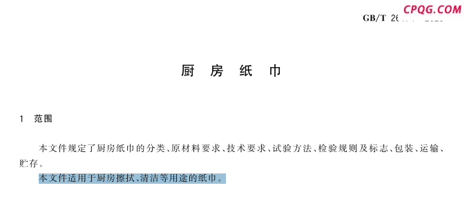 GB/T 26174―2023 《厨房纸巾》主要考虑的是厨房纸巾的擦拭、清洁用途。比如,它对厨房纸巾的吸水能力、吸油能力作出了明确规定,并且对纸张的抗张力(横向抗张强度、纵向湿抗张强度)等有要求,使得厨房纸满足吸水、吸油快的要求,同时又结实耐用,适合厨房使用场景。