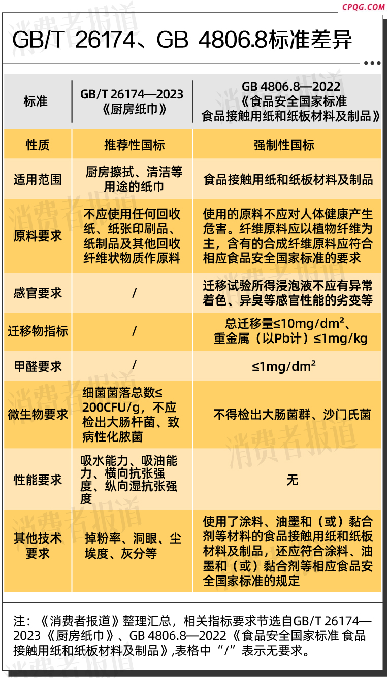 GB/T 26174―2023 《厨房纸巾》、GB 4806.8―2022 《食品安全国家标准 食品接触用纸和纸板材料及制品》这两个标准的具体区别在哪里?为何后者能长时间直接接触食物?
