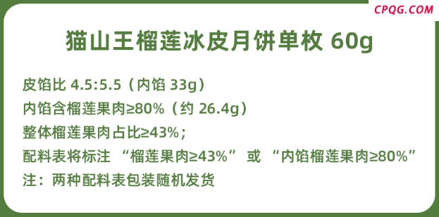 而在巧师傅相关产品的配料中,“榴莲果肉馅”排在第一位。根据电商宣传页面介绍,巧师傅猫山王榴莲果肉冰淇淋冰皮月饼的皮馅比为4.5:5.5,一块60克的月饼的榴莲果肉含量为26.4克。