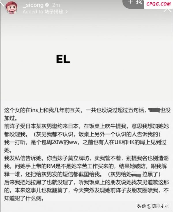 而后,王思聪又发布长文解释前因后果,称与网红EL社媒互关几年,两人说的话不超过5句,且没有私人联系方式。但是,该网红前阵子受灰产男邀约到日本参加饭局,在局上拿王思聪主动追她吹牛,王思聪事后听朋友提起不爽,向外打听称网红EL是一周包养费用20万的外围。