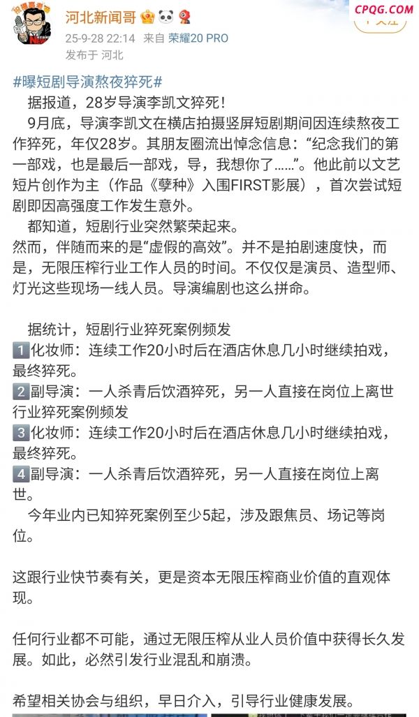 9月29日,娱乐圈28岁短剧导演熬夜猝死的消息持续发酵。