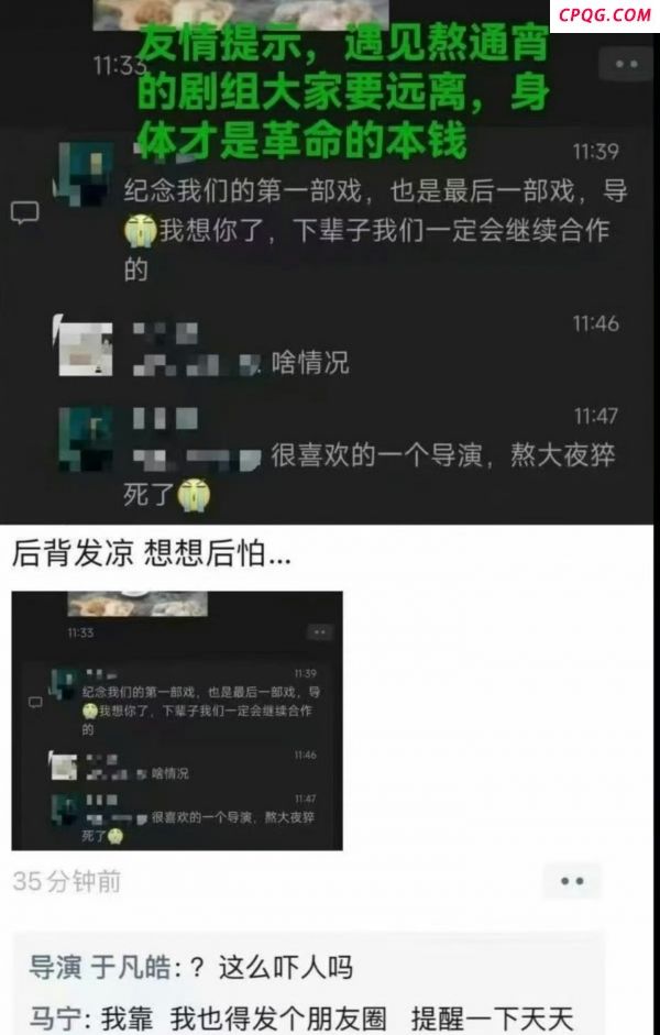 随后,八卦媒体晒出聊天记录,进一步 "证实" 有导演熬夜猝死,甚至称朋友圈已流传悼念信息。